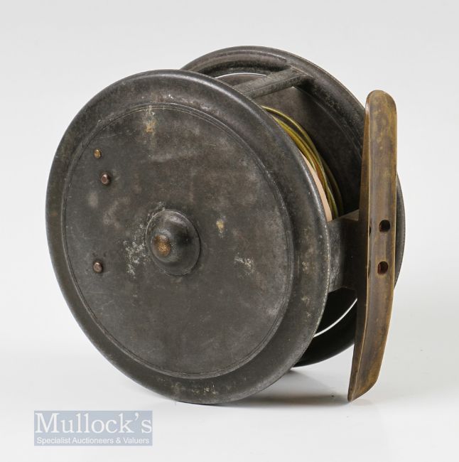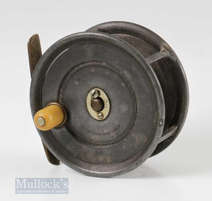 Early Hardy Bros Uniqua 4 ¼” Wide Drum Salmon Reel with white handle, twin screw oil drum latch, brass smooth foot having slight bend to one end, internally stamped 10 to frame and spool, runs smooth with constant check