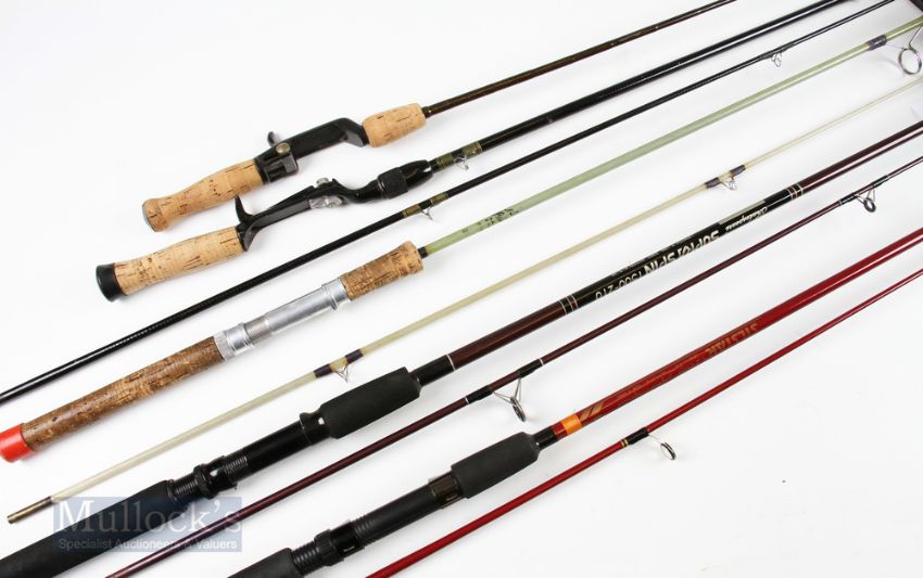 Shakespeare Supra Spin 1500-210 2.1m 2 Piece Rod with Silstar C2-665P graphite Spin 6ft 6in 2 piece rod, medium action, unnamed solid glass 7ft 2 piece spinning rod and 2x USA trigger bait casters. (5)