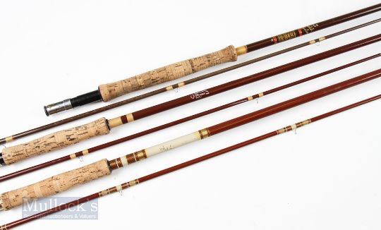 Hardy Bros Fibalite Perfection 9ft 6in 2 piece rod line 6/7# in need of attention with non-original reel seat, together with Match Master Flycaster 9ft 6in 2 piece, line 6/7# and an unnamed 9ft 6in 2 piece fly rod. (3)