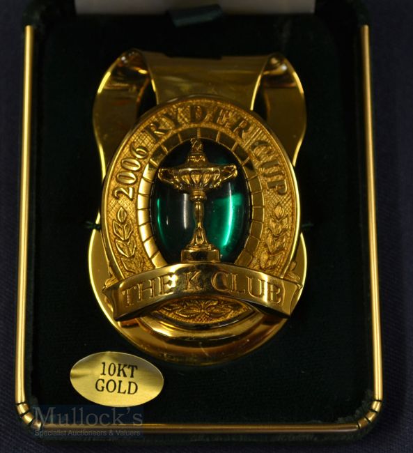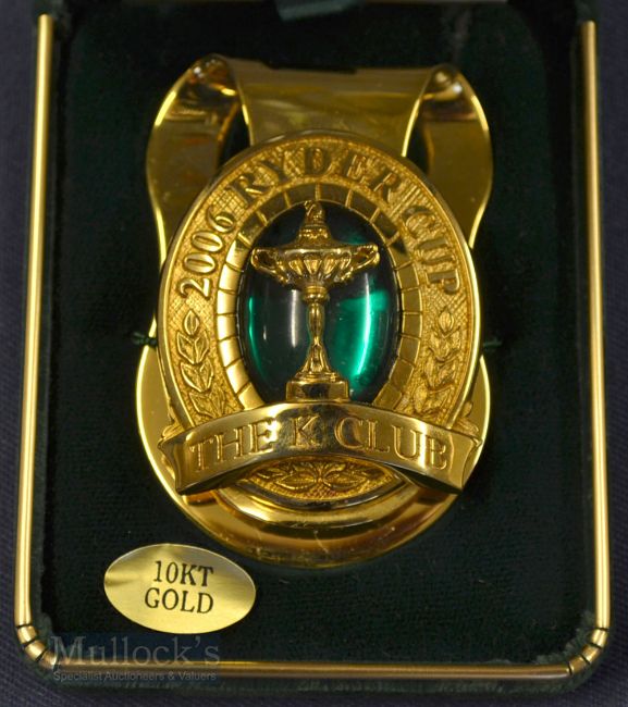 Rare 2006 Ryder Cup 10ct gold plated and emerald green enamel money clip given to players and officials – played at The K Club Ireland and won for the 3rd consecutive time by Europe equalling their record winning margin of two years earlier  –and comes in maker’s original emerald green box. Note: These items are exclusive limited edition items presented to team members and Official Party accompanying the European Ryder Cup team
