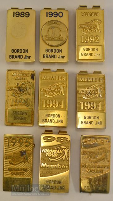 9x PGA European Tour Money Clips and Badges 1989-1998 to Gordon Brand jnr incl 6x money clips to Gordon Brand jnr, one missing front clasp, with 3x member guest badges, one missing pin to rear and another for Sheena Brand. Provenance: From the family of Gordon Brand jnr.