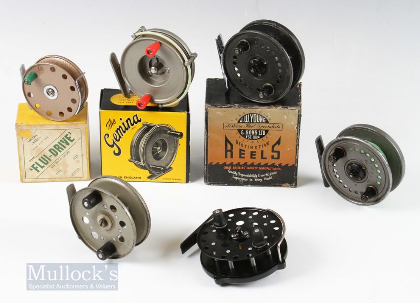Mixed Centrepin Fishing Reel Selection (6) incl J W Young & Son “The Seldex” 3 ½” twin handled reel with original box, Harrington “The Gemina” 3 ¼” twin handled reel with original box, Flui-Drive 3” reel with original box, “The Mentor” 3 ¾” reel with moveable line guard, Strike Right Hydraflo 3 ½” twin handled reel and an Allcocks Viking 3 ¾” twin handle reel, in good used conditions (6)