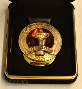 Rare 2001 Ryder Cup gold plated and enamel money clip given to players and official – for the match which was cancelled following the September Attacks in New York and postponed until 2002 played at The Belfry made by Michael De Mille and comes in makers original box with makers card details. Note: These items are exclusive limited edition items presented to team members and Official Party accompanying the European Ryder Cup team