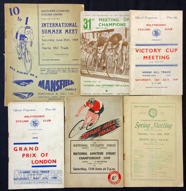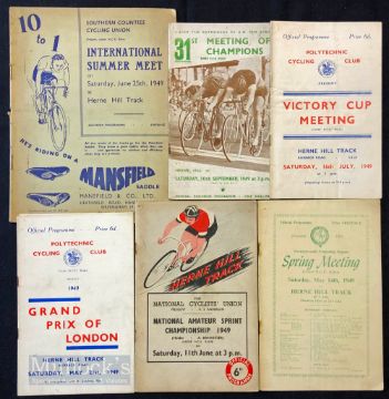 Cycling – Selection of 1949 Cycling Programme at Herne Hill incl 1949 Kentish Wheelers Spring Meeting, 1949 National Amateur Sprint Championship, 1949 Polytechnic Cycling Club Victory Cup Meeting, 1949 Polytechnic Cycling Club Grand Prix of London, 1949 International Summer Meet Southern Counties Cycling Union and 1949 31st Meeting of Champions – condition mixed A/G overall (6)