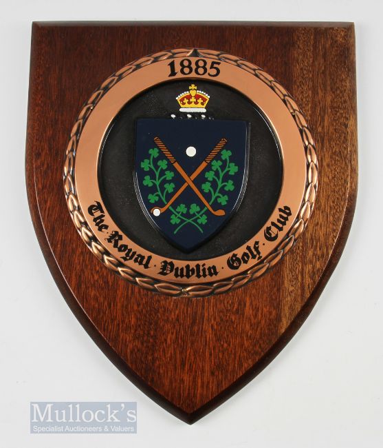 The Royal Dublin Golf Club Wooden Plaque with motif to centre on wooden shield plaque, measures 28x24cm approx.