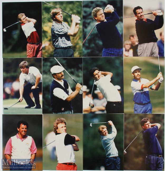 Collection of 3x Ryder Cup Books and European (11) and USA (10) players photographs (33) – books incl ‘1987 Ryder Cup’ (the first ever victory on USA Soil); ‘Easy Ryder’ 2006 K Club Ireland; Official History of The Ryder Cup 1927-1989 all with dust jackets (VG) together with collection of 1993 copyright colour photographs of Ryder Cup Players to incl Joakim Haeggman (1st Swede to play in the Ryder Cup), Barry Lane, Colin Montgomery, Sam Torrance, Peter Baker, Gordon Brand Jr, Jose-Maria Olazabal, Mark James, Bernard Gallacher, Bernhard Langer, Steve Richardson, and Paul Broadhurst; USA players include Payne Stewart John Cook, Paul Azinger, Davis Love III, Jeff Beck, Mark O’Meara, Tom Kite, Corrie paving, Lee Jansen and Fred Couples – all measure 7” x 5”