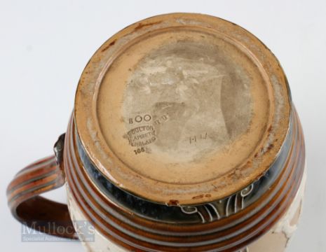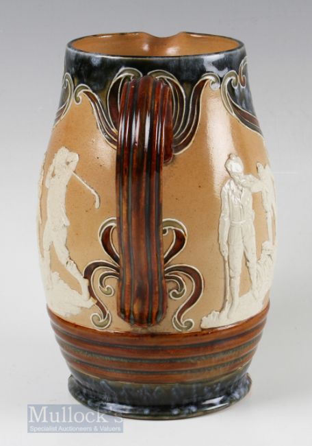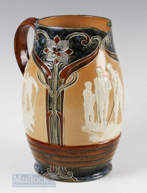 Doulton Lambeth Art Nouveau Stoneware Golfing Scene Design Pitcher having 3 white relief designs Lost Ball, Putting and the Drive with stylised foliage decoration to rim separating the panels, stamped to base with makers marks with number “166”, height 21.5cm, good condition. Note From The David Easby Estate