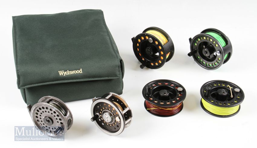 Wychwood Padded Case and Fly Reels – incl Airflo 3 ¾” composite reel and spare spool, Intrepid 3 3/8”, Martin US MG-7LS 3 3/8” reel and an unnamed composite 7/8 3 ¾” and spare spool, missing drag knob, all run smooth