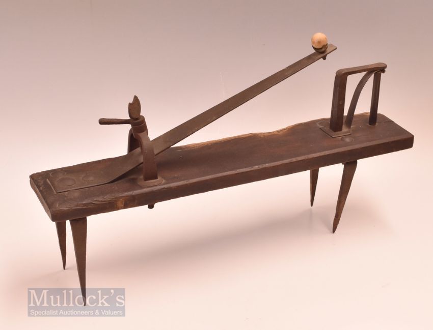 Late 19th early 20th century Knurr & Spell ball game launcher – comprising horizontal wooden plank with attached iron spikes and a spring loaded contraption, the Spell is placed on the ground and throws the Knurr (Ball or Stone) into the air to which the player strikes with a bat or stick – overall 14”h x 24”L x 5”w (including cast-iron ground spikes) with small wooden ball. Note the game originated in the moors of Yorkshire, in England, but then spread throughout the north of England. It can be traced back to the beginning of the 14th century [citation needed]. It was especially popular in the 18th and 19th centuries, but was virtually unknown by the 21st century. Note From The David Easby Estate