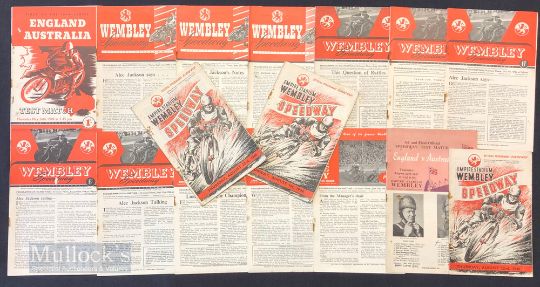 1946, 1947-1949 Wembley Speedway Programmes featuring 46 British Speedway Riders Championship (x3), 47 England v Australia, West Ham, New Cross (London Cup Final), Belle Vue (Trophy), 48 Harringay (Trophy SF), Speedway Riders Championship, New Cross (Trophy), Belle Vue (Trophy), New Cross (London Cup Final), 49 Speedway Championship of the World, Harringay (Cup), Belle Vue and England v Australia, condition mixed, rusted staples to some, age related wear, generally A/G overall (16)