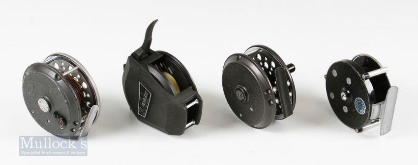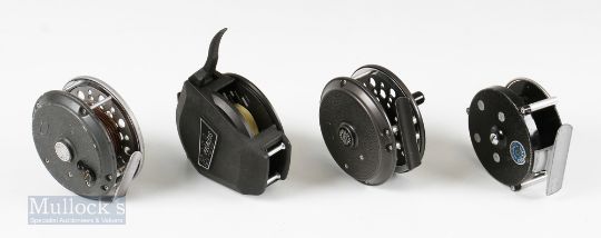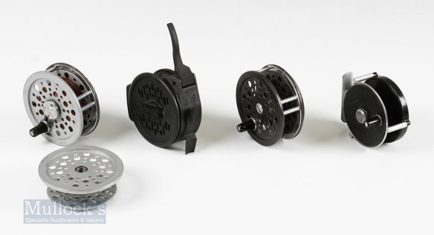 Shakespeare Super Condex 3 ½” Fly Reel with original pouch, together with Shakespeare Speedex 3 ½” reel and spare spool, JW Young & Son The Valdex reel and Peerless Bam graphite level action retrieve fly reel (4)