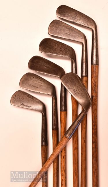 Good selection of men’s and ladies golf irons (7) – J H Taylor Autograph mashie, another with Eye cleek mark, smf mashie, smf cleek, smf mid iron, and 2x ladies mashie irons