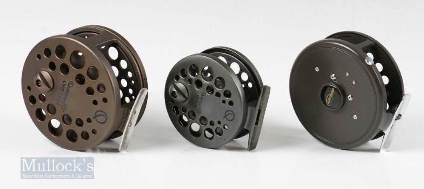 2x Quantum Fly Fishing Reels – QFR78 LA large arbor 4 ¾” and a QFR56 3 ¼” reel, both with counterbalance handles and original boxes, both appear unused, together with an Airflo 3 ¾” fly reel with counterbalance handle plus drag adjuster, with box appears unused (3)