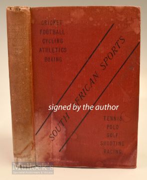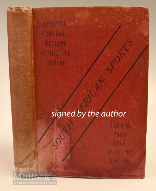 Parker, G A signed – “”South African Sports-Cricket, Football, Athletics, Cycling, Tennis, Racing, Polo, Golf, Gymnastics, Boxing, Shooting et al - an official handbook with portraits of leading athletes and officials” 1st ed 1897 signed with the authors compliments and dated 1926 - in the original red cloth boards (some stains to the front and the bottom of the spine and to the back board) - some faults inside including minor tears, advertisements to both the front and rear (mostly discoloured) an interesting book not seen before but (AF) Note From The David Easby Estate