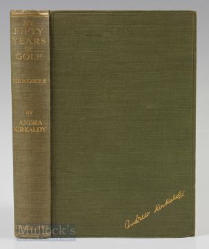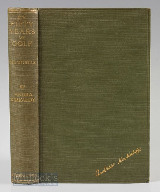 Kirkaldy, Andrew signed – “Fifty Years of Golf – My Memories” 1st ed 1921 publ’d T Fisher Unwin Ltd London in original green and gilt golf boards (G) and signed Andra Kirkaldy with dedication following his visit to Inverness dated 23-3-23 to the front free end plate - numerous illustrations, uncut edges - some speckle foxing to closed pages – otherwise a very good clean copy