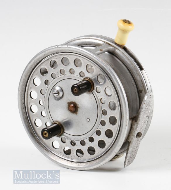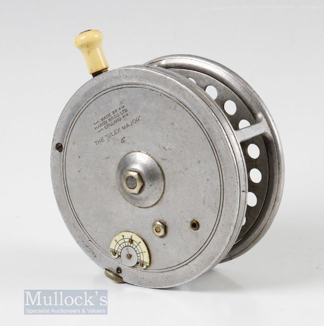 Scarce Hardy The Silex Major 4” Hiduminium Unpolished Reel with twin black handles, button spool release, rim tension regulator, inside of frame stamped J.D., good overall condition, runs smooth with strong check.