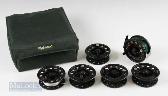 Wychwood Reel Bag and Contents 8 compartment reel case with an unnamed 3 ¾” composite fly reel with counterbalance handle and 5 spare spools (7)