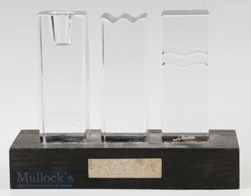 1987 Gordon Brand Jnr Swedish Osterakers Kommun Seo Winner Trophy of 3 glass section construction mounted to a wooden base with silver plaque to front, length 19cm. Provenance: This item has been consigned to sale from Gordon Brand Jnr’s family.