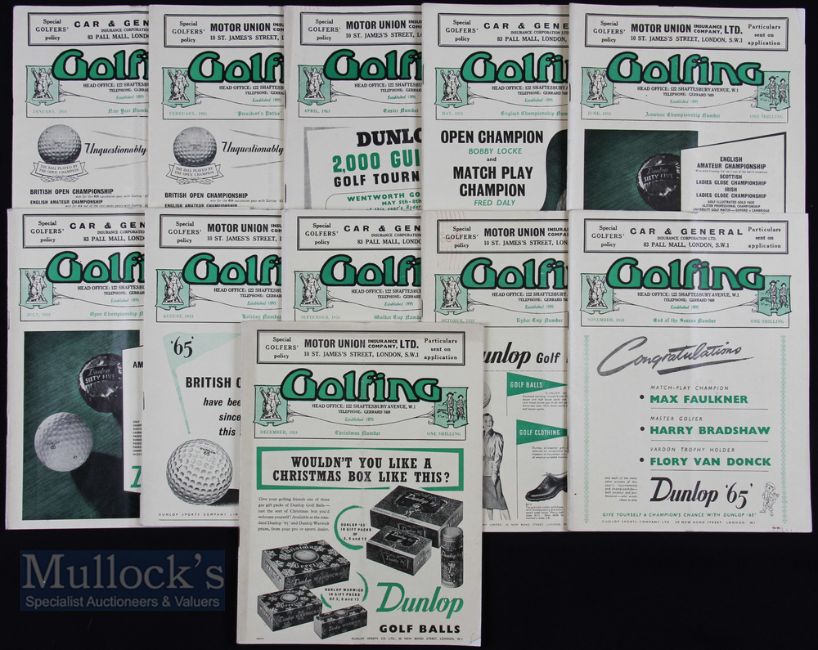 1953 Golfing and Ladies Golf monthly magazines (11) – a near complete run missing only March issue covering all the major golfing events front covers still featuring Dunlop 65, Players and Major Golfing Events c/w advertisements et al - some with slight staple rust otherwise (F/G) Note From The David Easby Estate