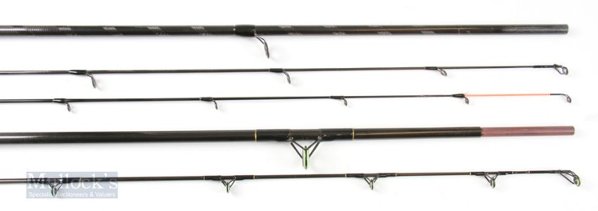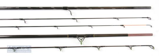 Shimano Hyperloop Barbel Power 12ft 2 Piece Rod with spare tip, appears unused, with an Abu Carbon Specimen 11ft 2 piece rod with very light use, both retaining plastic to handles, in mcb. (2)