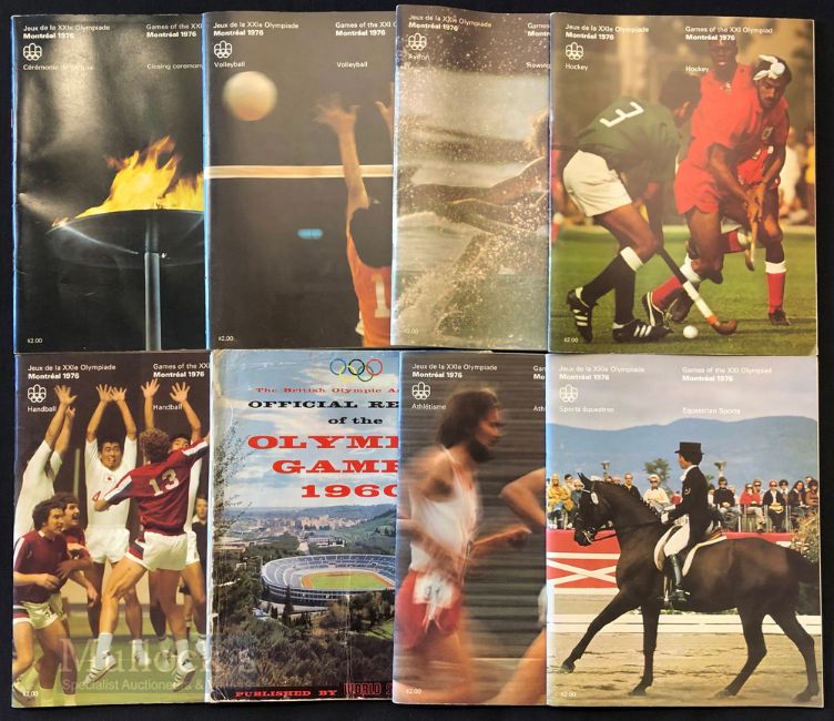 1976 Summer Olympics ‘Montreal 1976’ Programmes featuring the Closing Ceremony, Athletics, Equestrian Sports, Handball, Hockey, Rowing, Volleyball, together with the Official Report of the Olympic Games 1960 publication (wear at spine) – overall condition appears good generally (8)