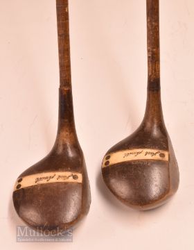2x matching F H AYRES Staynorus large playable woods – brassie and spoon both inlaid to the crown with Jack Smith professional details to the ivorine plaque – both with alloy sole plate stamped Staynorus rustless – both the F H Ayres shaft stamp below the original full length leather grips – one has a slight crack to the top of the neck which is easily rectifiable – if anyone is looking for a pair of attractive playable woods these are a must have