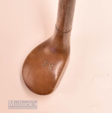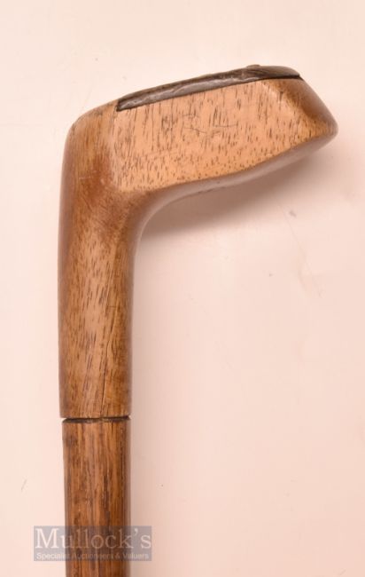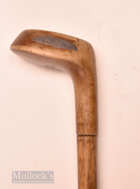 Early Sunday Golf Walking Stick fitted with light stained socket head wood handle – stamped with the initials S T to the crown, horn sole insert – no tip (shortened) – overall 33”