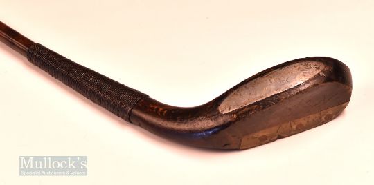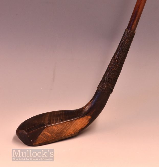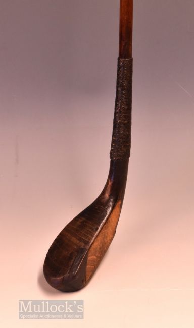 Tom Morris dark stained beech wood late longnose putter c1885 – faint stamp to the crown, toe end leather face insert and fitted with green heart shaft and fine original hide grip with underlisting. Note From The David Easby Estate