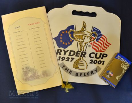 3x Ryder Cup Items from 1999 and 2001 (3) – 1999 Ryder Cup Brook Line USA Welcome Dinner Menu (VG); 2001 Ryder Cup The Belfry Spectator’s Kneeling Pad and 2001 Ryder Cup Radio in makers original box – used no batteries hence display only.