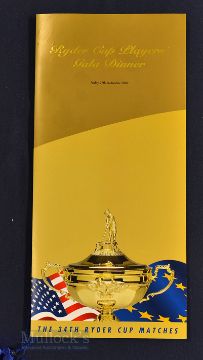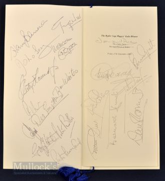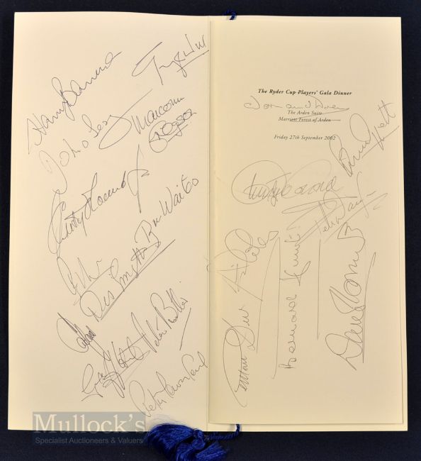 Rare 2002 Ryder Cup Past Players Gala Dinner Signed Menu – held on Friday 27th September 2002 at Forest of Arden and signed by 20 past players – the dinner was held to present all past players with their replica half size Ryder Cup Trophies – players included Harry Bannerman, John O’Leary, George Will, Malcolm Gregson, Christy O’Connor Jnr, Brain Waites, Des Smyth, Bernard Hunt, Geoff Hunt, Peter Butler, Peter Townsend, Christy O’Connor, Neil Coles, Dave Thomas, Brian Huggett, et al. Note These individual Dinner Menus are from a strictly and exclusive limited edition only distributed post-match between both Teams, their Official Parties and Corporate Partners