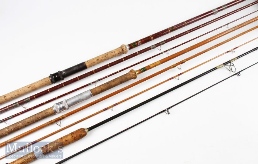 Rods (3) – Edgar Sealey Octopus Split Cane 10ft 6in Float Rod missing first ring, with another similar Octopus hollow glass 12ft 3 piece de-luxe float rod and an unnamed 6ft 2 piece spinning rod, all show signs of wear (3)