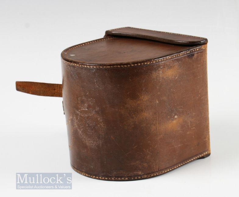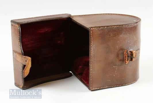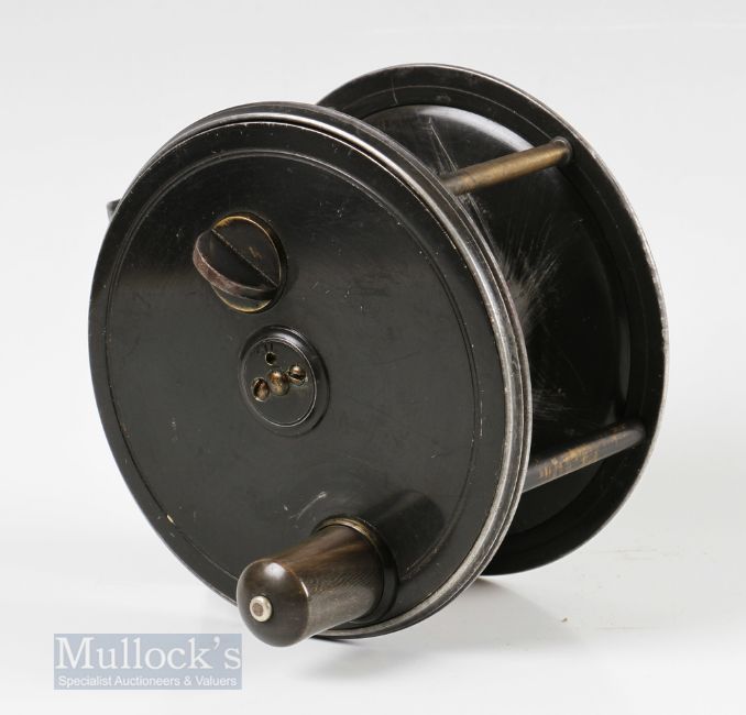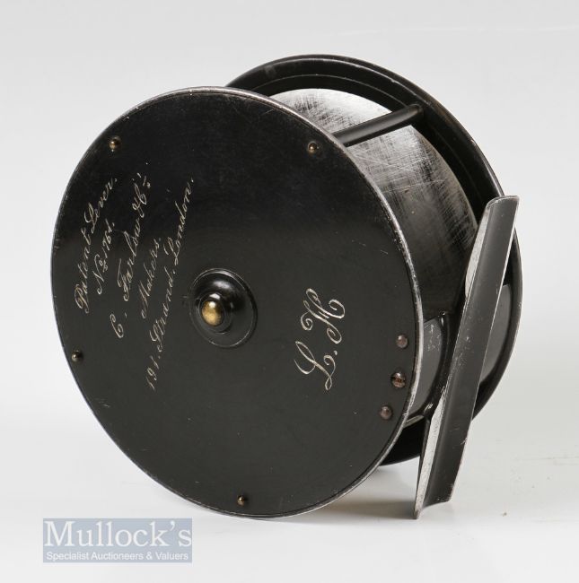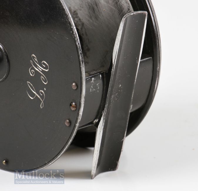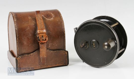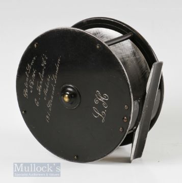 Kelson C Farlow London Patent 1761 4 ½” Patent Lever Fly Reel and Block Case with brass pillars, Kelson brake to faceplate with horn handle, engraved script makers details to rear with initials L.H., runs smooth, foot showing some file marks and trimming, housed in C Farlow leather D block case, top having matching L.H initials