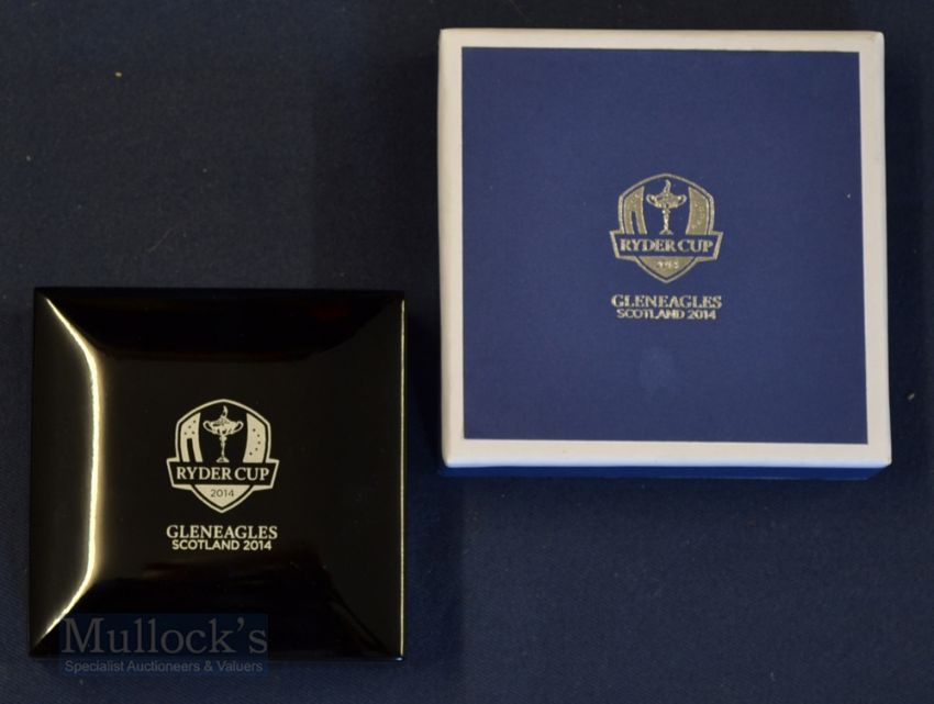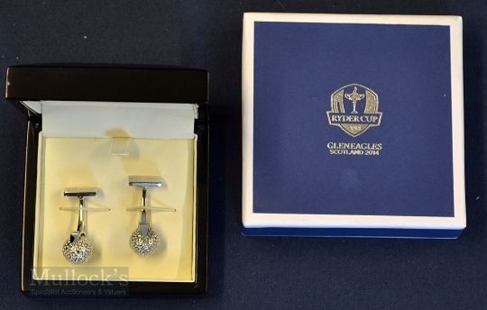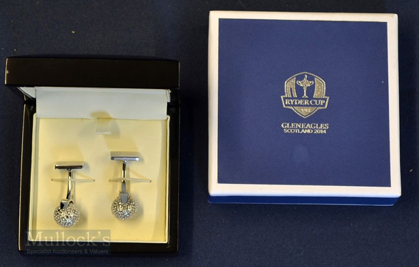 Pair of 2014 Official Ryder Cup Interesting white metal Cuff Links – made by Thomas Lyte engraved with Ryder Cup Logos to the hinge and spinning golf ball opposite – c/w all its boxes with Ryder Cup Logos.