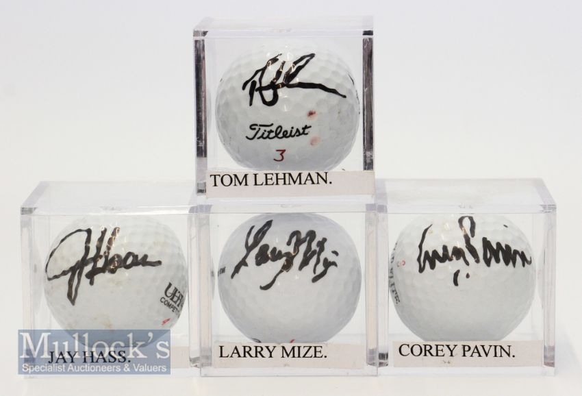 4x USA Major and PGA Tour Winners signed golf balls from the 1990s – Larry Mize (Master Champion remembered for that Chip shot off the green); Corey Pavin (US Open Champions); Tom Lehman (Open Champion and numerous Achievement Awards ) and Jay Haas prolific Tour Player winning several Achievement Awards.