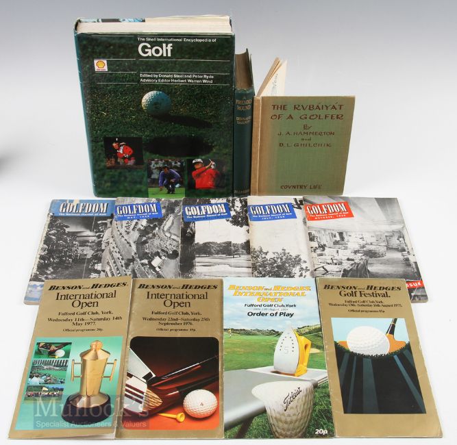 1949 ‘Golfdom – The Business Journal of Golf’ Magazines featuring October 49, July 49, January 49, May 49, and March 50, together with European Tour Draw sheets for 1975/76/77 and 84, books including The Shell International Encyclopaedia of Golf, A Friendly Round 1st ed by Bernard Darwin and The Rubiyat of a Golfer 1st ed by Hammerton & Ghilchick (12)