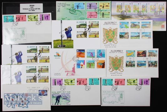 Collection of Channel Islands First Day Covers incl Isle of Man, Guernsey, Alderney, Royal Jersey GC Centenary, La Moye GC Centenary – general condition appears G overall (12)