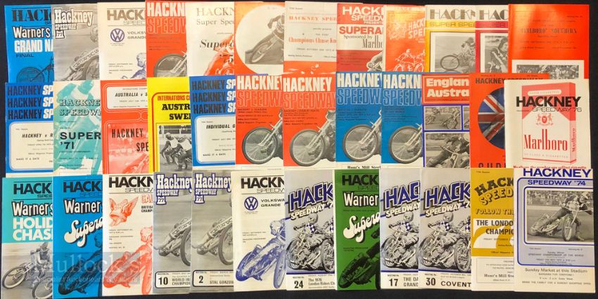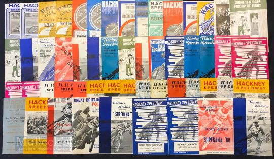 Selection of 1960s/70s Hackney Speedway Programmes featuring a wide range of years, incl 66 Great Britain v Poland, 67 Superama, 67 London Junior Championship, 1967 World Championship British Qual, 69 Superama, 69 London Riders Championship, 66 Four Team Event, 66 London Riders Championship, 65 Hackney v Overseas, 63 Provincial Riders Championship, 63 Hackney v Overseas, plus others, condition appears A/G overall (#85)
