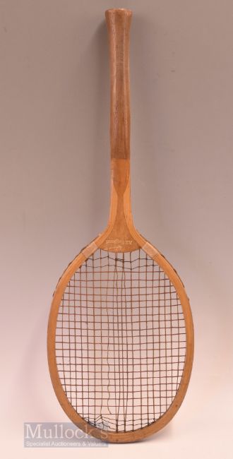 Wallis Bros Lincoln ‘The All England’ wooden fantail tennis racket with makers motif to convex wedge, shoulder whipping, couple of strings broken, otherwise an A/G example overall