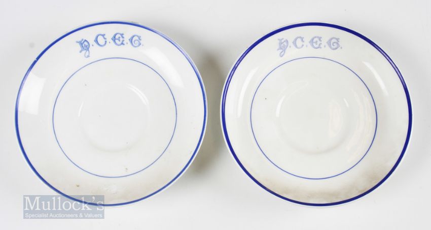 Pair of Honourable Company of Edinburgh Golfers Saucers both white saucers with blue initials and stripes, one by Royal China Works Worcester with date letter for 1902 and the other by Fenton, both 6 ¼” dia. (2) Note From The David Easby Estate