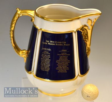 2010 Ryder Cup Large and Impressive Decorative Bone China Water Pitcher – made by Pickard “Proudly in America” decorated with Ryder Cup Details on the one side and details and names of both teams on the opposite side played in Wales for the first time at Celtic Manor and won by Europe after Sunday’s singles was postponed and played the following day in close fought match with Europe coming out on top 14.5 – 13.5 overall 8”h (20cm). Note – The above is a special one off Ryder Cup Golf Item given by either The US PGA or The PGA to Players and Officials Only – quite unique item