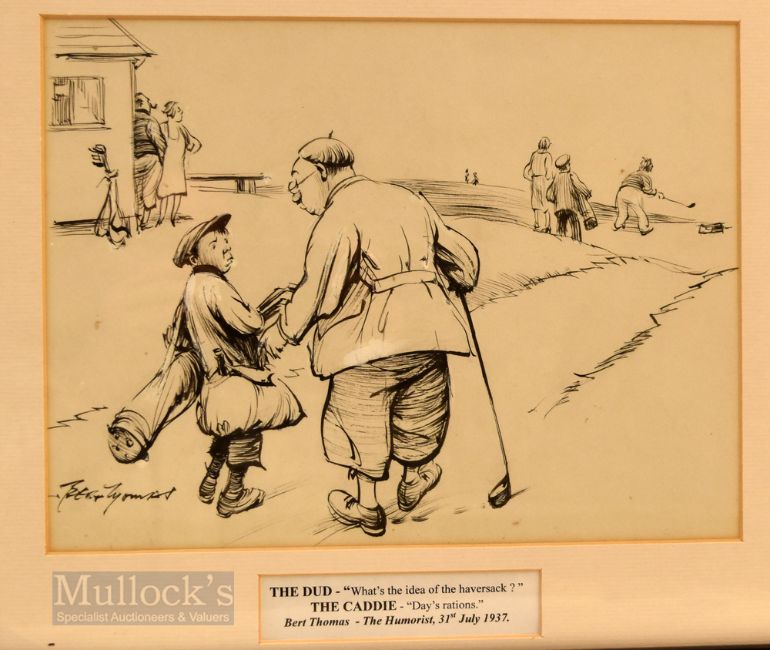 Bert Thomas (b.1883-d.1966) Original humourist pen and ink golfing sketch titled “The Dud & The Caddie” – signed lower left corner - illustrated in Humorist 31st July 1937 c/w annotation below – image 8.5 x 11.25” – mf&g overall 13.75” x 16”. Note From The David Easby Estate