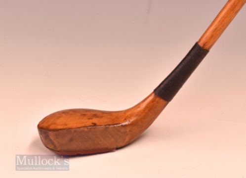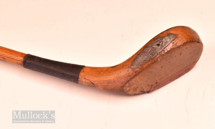 Unnamed transitional golden beech wood scare neck driver – with red fibre sole insert and fitted with original full length tan hide grip with underlisting – overall 45.5” rigid shaft. Note From The David Easby Estate