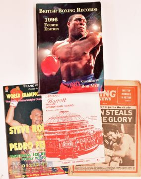 1971 Joe Bugner v Carl Gizzi Boxing Programme at Royal Albert Hall, date Tuesday 19th January, plus 1995 Steve Robinson v Pedro Ferradas boxing programme 7th July 1983 Boxing News Newspaper, together with 1996 British Boxing Records Book large SB by Bob Mee – condition generally is A/G overall (4)