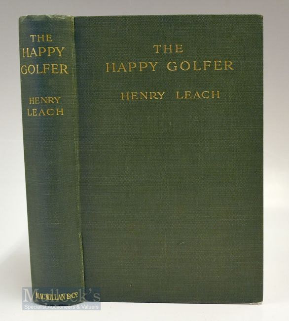 Leach, Henry - “The Happy Golfer – being some experiences, reflections, and a few deductions of a wandering player” 1st ed 1914 publ’d Macmillan & Co London - in green and gilt cloth boards and spine – some light discolouring to both front and rear free end plates – some speckle foxing to closed pages otherwise very clean tight copy hence (VG), scarce. Note The book contains early accounts on the American golf game; 4pp on golf course architecture et al