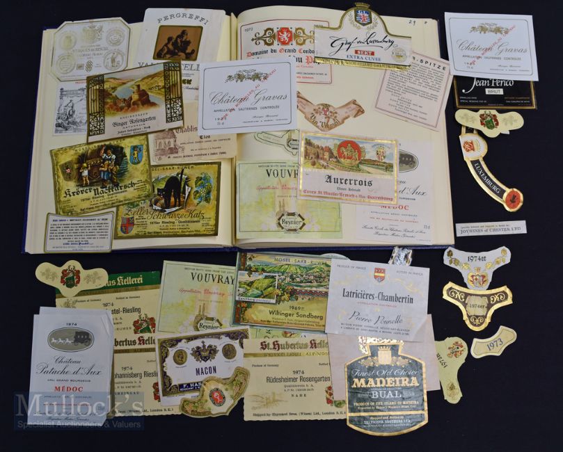 c1970 Wine Bottle Labels Collection on and off paper in cuttings book, noted examples of Bouchard Pere & Fils 1972, Bergerac Sec Sauvignon, Chateau Mougneaux (Qty)