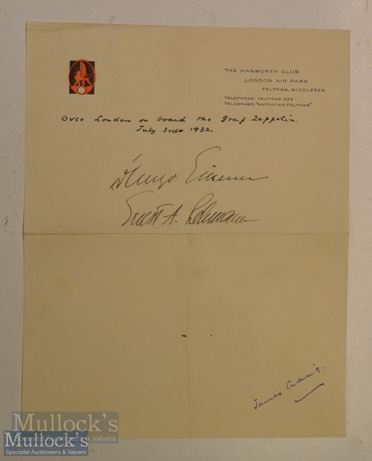 Capt. Ernst A Lehmann Signed Note – inscribed 'Over London on board the Graf Zeppelin July 3rd 1932', with signatures below including Hugo Eckener, Capt. Ernst A. Lehmann and James Craig Prime Minister of Northern Ireland (1921), on The Haworth Club London headed notepaper.