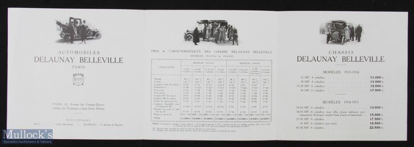 Delaunay Belleville Luxury Cars, Paris, 1915 Trade. An attractive 3 fold sales catalogue with four illustrations & detailing with prices their range of 9 models of automobiles ranging from 12hp 4 cylinder cars to 45hp 6 cylinder cars. Printed on the finest quality semi-gloss card. Folds out to size 6¾" x 19"