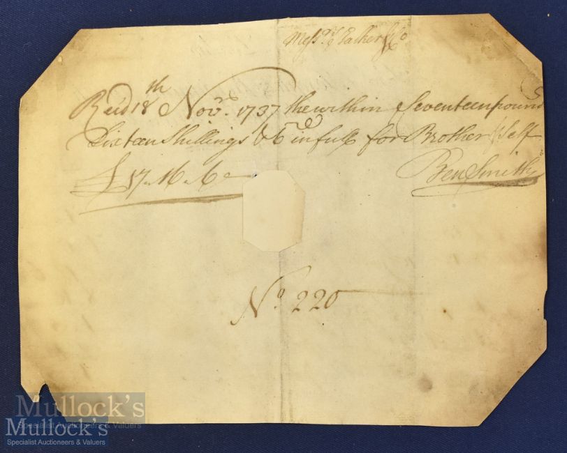 Very Early 1736 Printed Bill Bought of Joseph & Benjamin Smith Distillers at Ye Two Golden Pots in Aldersgate Street, near to bars. Bill for total of 117 gallons of Spirits for £17-11-6d. Black printing with manuscript annotations, size 8" x 6"