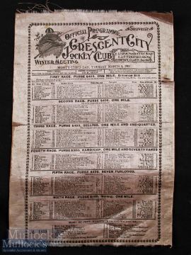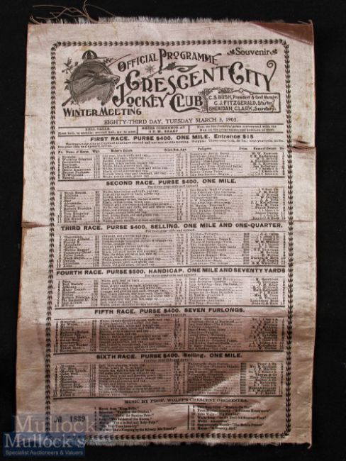 United States - Crescent City Jockey Club 1903 Silk Programme of that day's horse races. Listing the horses, their details and the owners in the six races of that day, size 9¼" x 13¼"