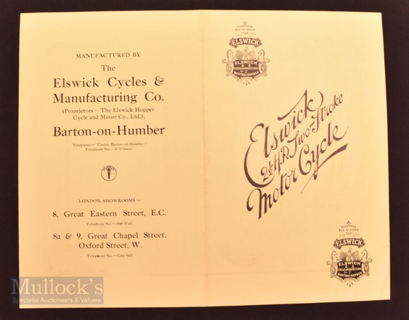 The Elswick 2½ HP Two-Stroke Motorcycle, circa 1913. A 4-page Brochure illustrating and detailing with specifications this machine for £34.6.0d. Printed on fine semi-gloss paper, size folded 5" x 8". Manufactured at Barton on Humber.